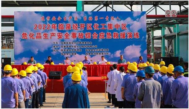 为了更好地提升半岛体育app、临泉经开区化工集中区应急救援处置能力,检验危化品泄漏应急救援方案的适用性和应急救援队伍处置突发事件的及时性、有效性,查找应急救援建设中的薄弱环节,以便更好地完善危化品半岛体育app、临泉经开区化工集中区应急救援体系,提升应对防范风险和事故的能力,遏制重特大事故的发生,2022年6月30日下午,由临泉县经开区化工集中区主办、临泉县应急管理局、临泉县生态环境分局、临泉县卫健委、临泉县消防救援大队协办、半岛体育app承办的危化品生产安全事故综合应急救援演练在我公司重大危险源液氨罐区举办。
