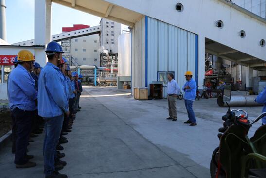 机修车间列队欢迎张董事长,感谢公司对员工的关怀,认真聆听董事长的讲话。