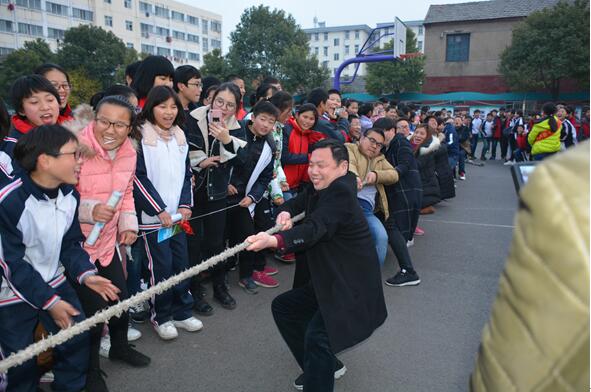 拔河比赛是体育展演的一项重要内容。各班代表队都显示出最强的比赛阵容,齐心协力,勇争第一!当比赛的哨声响起,只见参赛的队员们紧握长绳,卯足了劲拼命往后拉!老师和学生自发组成啦啦队为比赛队员加油助威,哨子声、呐喊声此起彼伏,响彻校园,现场激烈的比赛将整个活动推到了高潮!比赛过程中,各年级组参赛队员努力拼搏,无论是场上还是场下,气氛都异常激烈。比赛结束后,同学们仍意犹未尽,八九年级学生冠军队与教师队进行一场别开生面的友谊赛,李校长亲自上阵,将拔河比赛推向了另一个高潮!