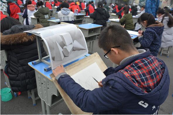 书画展演分书法组和绘画组,全校200多名选手齐聚操场,现场竞技。一个个遒劲有力的钢笔字跃然纸上,一幅幅栩栩如生的绘画作品逐渐清晰的呈现出来,随着一份份杰作的“出炉”,选手们自信的微笑呈现在脸上,幸福荡漾在心中。