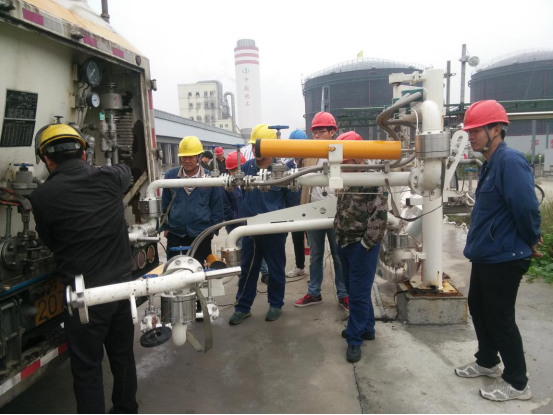 下午2:00,化二车间主任和LNG岗位负责人以及岗位的工作人员跟随罐车来到了充装现场进行观摩、学习。因为知道有罐车要来,半岛(中国)提前就把充车泵进行冷却做好了准备工作,罐车来了以后直接就可以连接鹤管。罐车司机在连接鹤管的时候大家都围上去,静静的看着罐车司机一步一步地操作,并且不断的跟随航天低温厂家的人学习如何调节各个阀门的,在充装的过程中不断地询问着厂家人其中的原理。经过几个小时的等待,LNG的首次充装完成了!
