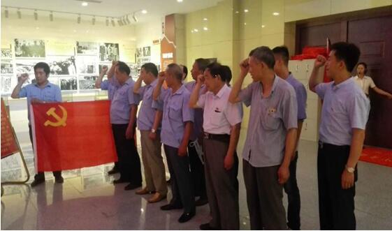 在纪念馆纪念大厅,纪检书记殷贺红的带领全体党员重温入党誓词。