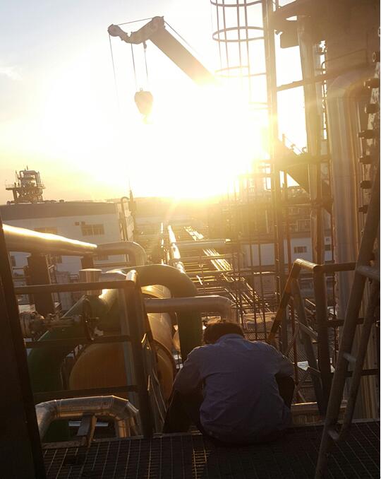 21时许,中午的烈日早已变得温柔,远远挂在半山腰朝着半岛(中国)微笑,我站在汽提塔顶部,看着碧蓝的天空被几朵洁白的云彩镶嵌着,长长输煤栈桥下不时还盘旋着几只白鸽。我的心情不自觉的开阔起来。楼下总控室前的伙伴正想我招手“下来吃饭了。”看看刚刚盖上封头的汽提塔,长长的出了口气,终于圆满完成检修任务。