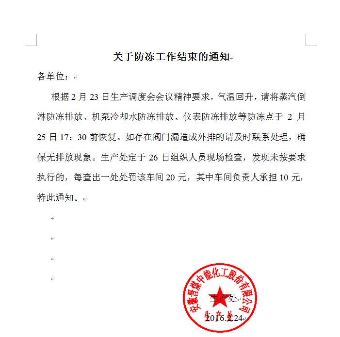 关于防冻工作结束的通知